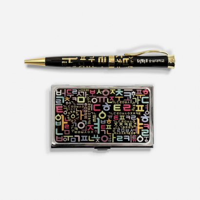 한글 자모음 패턴 디자인에 숭실대 로고가 각인된 볼펜 + 자개 명함집 세트