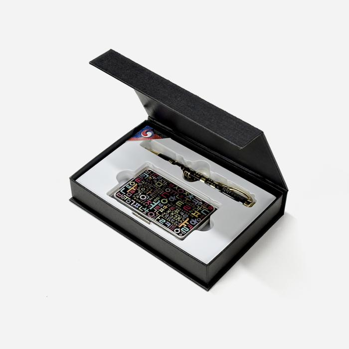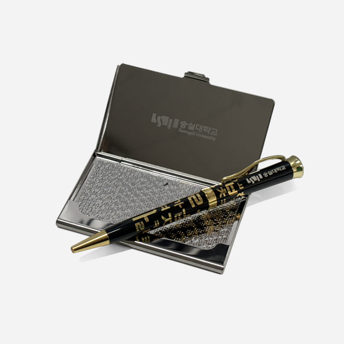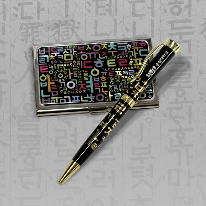한글 자모음 패턴 디자인에 숭실대 로고가 각인된 볼펜 + 자개 명함집 세트