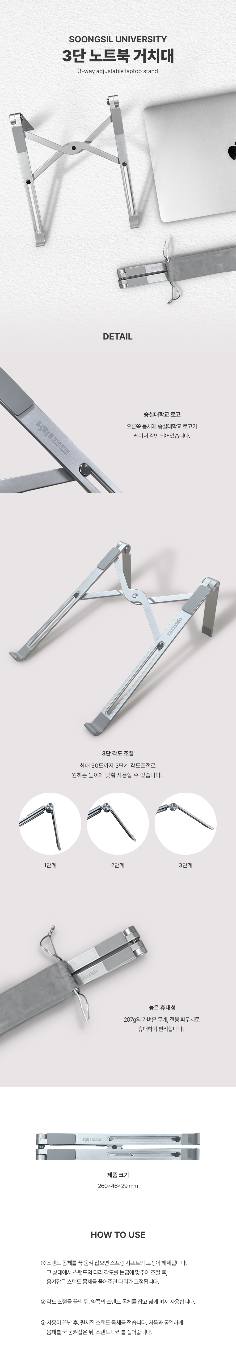 숭실대학교 로고가 각인된 초경량 3단 노트북 거치대